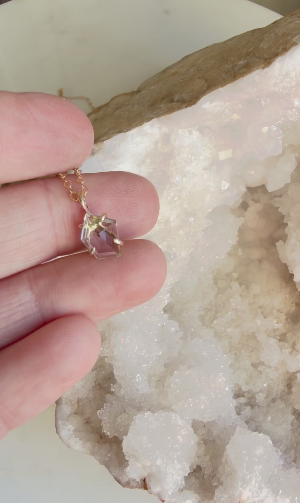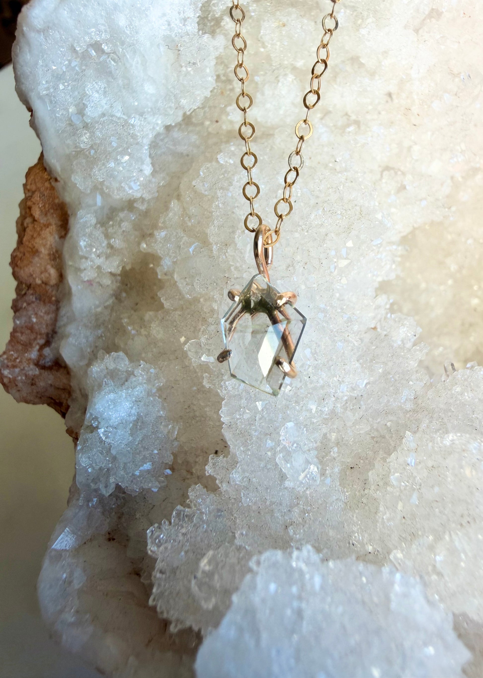 This sunstone is almost clear but has the palest seafoam green coloring at an angle. She’s a subtle color but has a beautiful sparkle, catching light from every direction on her rose cut face.